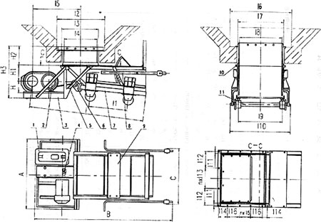 1、減速機(jī) 2、電動(dòng)機(jī) 3、傳動(dòng)平臺(tái) 4、聯(lián)軸器 5、H形架 6、連桿 7、給煤槽 8、閘門 9、機(jī)架 10、漏斗 11、托輥