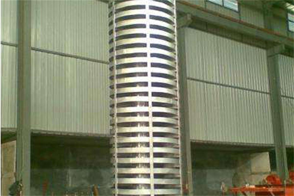 垂直振動(dòng)輸送機(jī)是通過激振器強(qiáng)迫振動(dòng),使輸送塔作沿垂直方向的直線振動(dòng)和繞鉛垂中心軸的扭動(dòng)振動(dòng),兩個(gè)振動(dòng)的合成,使物料朝 螺旋運(yùn)動(dòng)的方向斜拋,形成了物料沿螺旋槽向上的輸送過程。垂直振動(dòng)輸送機(jī)是由提升槽、振動(dòng)電機(jī)、減振系統(tǒng)和底座等組成。垂直振動(dòng)輸送機(jī)分開槽式、封閉式兩種結(jié)構(gòu)。